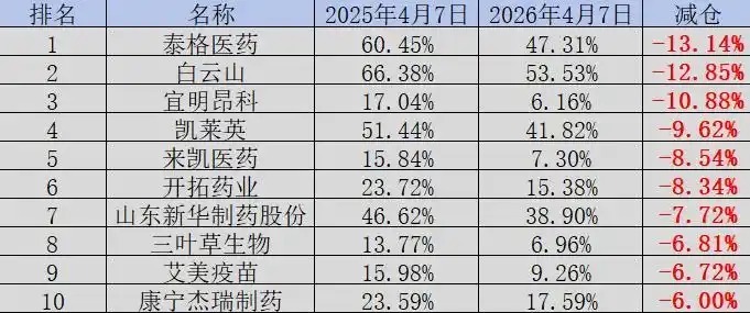 一边是逆势加仓,另一边则是主动减仓。在行业整体呈现复苏态势的背景下,仍有10家港股医药公司遭遇内资大幅减仓(减仓比例超6%),分别是:泰格医药、白云山、宜明昂科、凯莱英、来凯医药、开拓药业、山东新华制药股份、三叶草生物、艾美疫苗、康宁杰瑞制药。