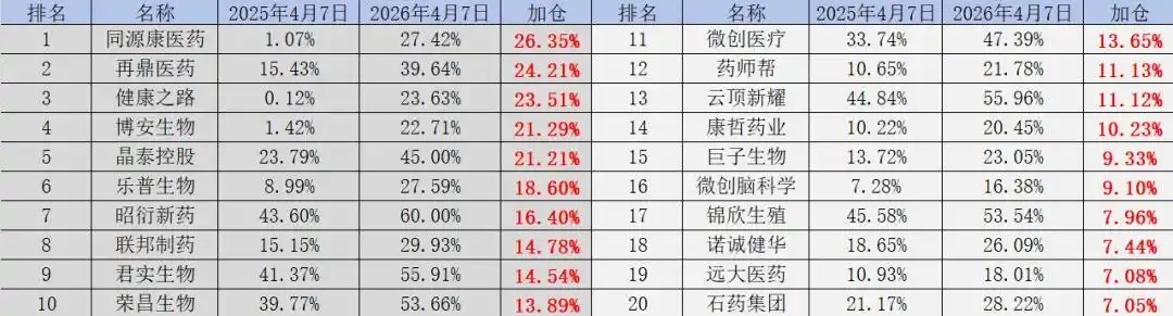 在持股占比提升最快的20家公司榜单中,这一逻辑体现得淋漓尽致。同源康医药、再鼎医药、健康之路、博安生物、晶泰控股、乐普生物、昭衍新药、联邦制药、荣昌生物、微创医疗、药师帮、云顶新耀、康哲药业、巨子生物、微创脑科学、锦欣生殖、诺诚健华、远大医药、石药集团,成为内资持股占比提升最快的20家港股医药公司。