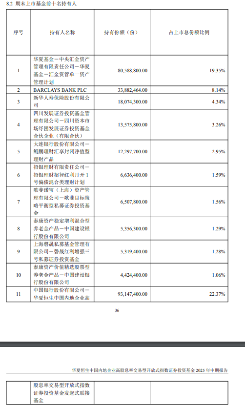 截至6月30日,“华夏基金-中央汇金资产管理有限责任公司-华夏基金-汇金资管单一资产管理计划”出现在18只ETF前十大持有人名单中,共持有32.96亿份。